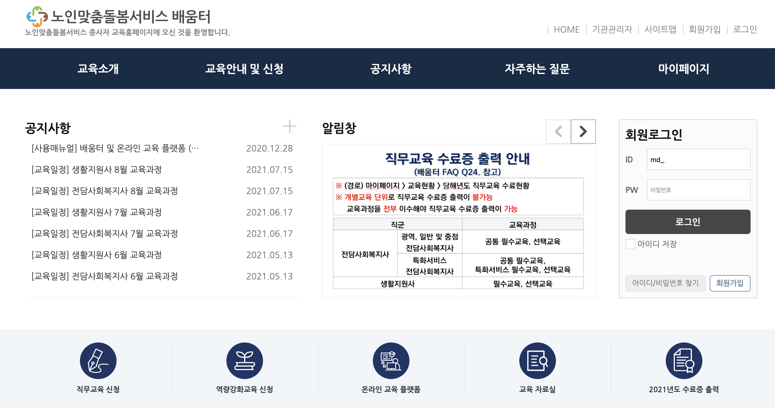 독거노인종합지원센터 직무교육 생활지원사 필수교육 온라인 [18차 생활지원사] 필수교육 접수 : 21.07.19 ~ 21.07.28 교육 : 21.08.02 ~ 21.08.15 독거노인종합지원센터 직무교육 생활지원사 선택교육 온