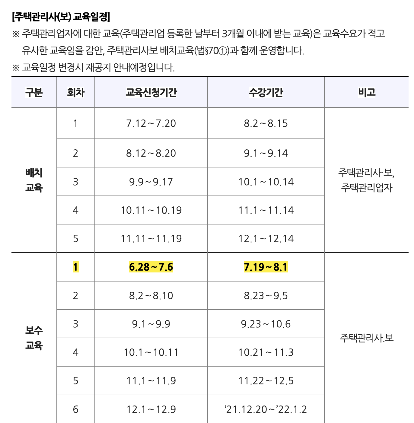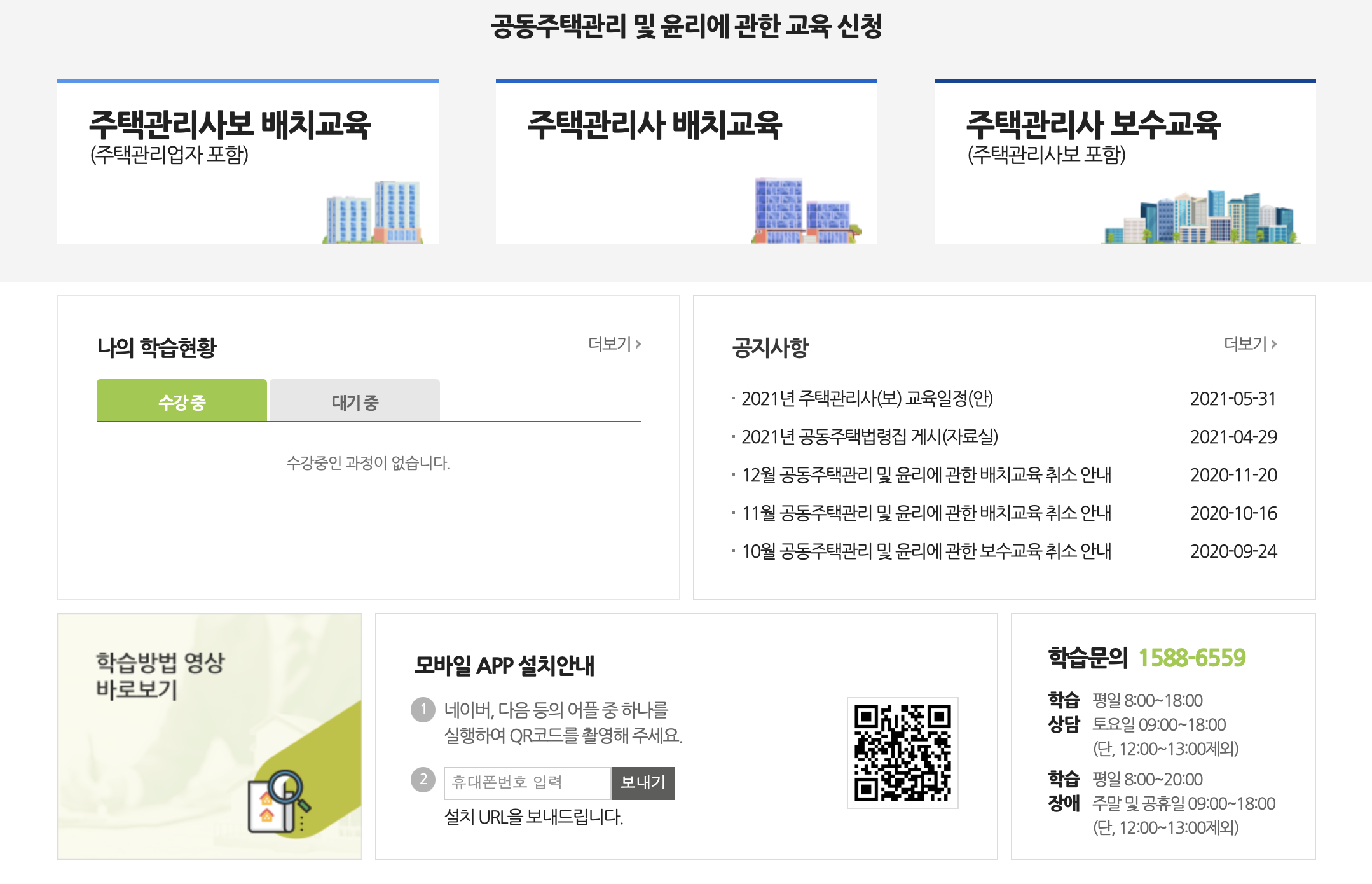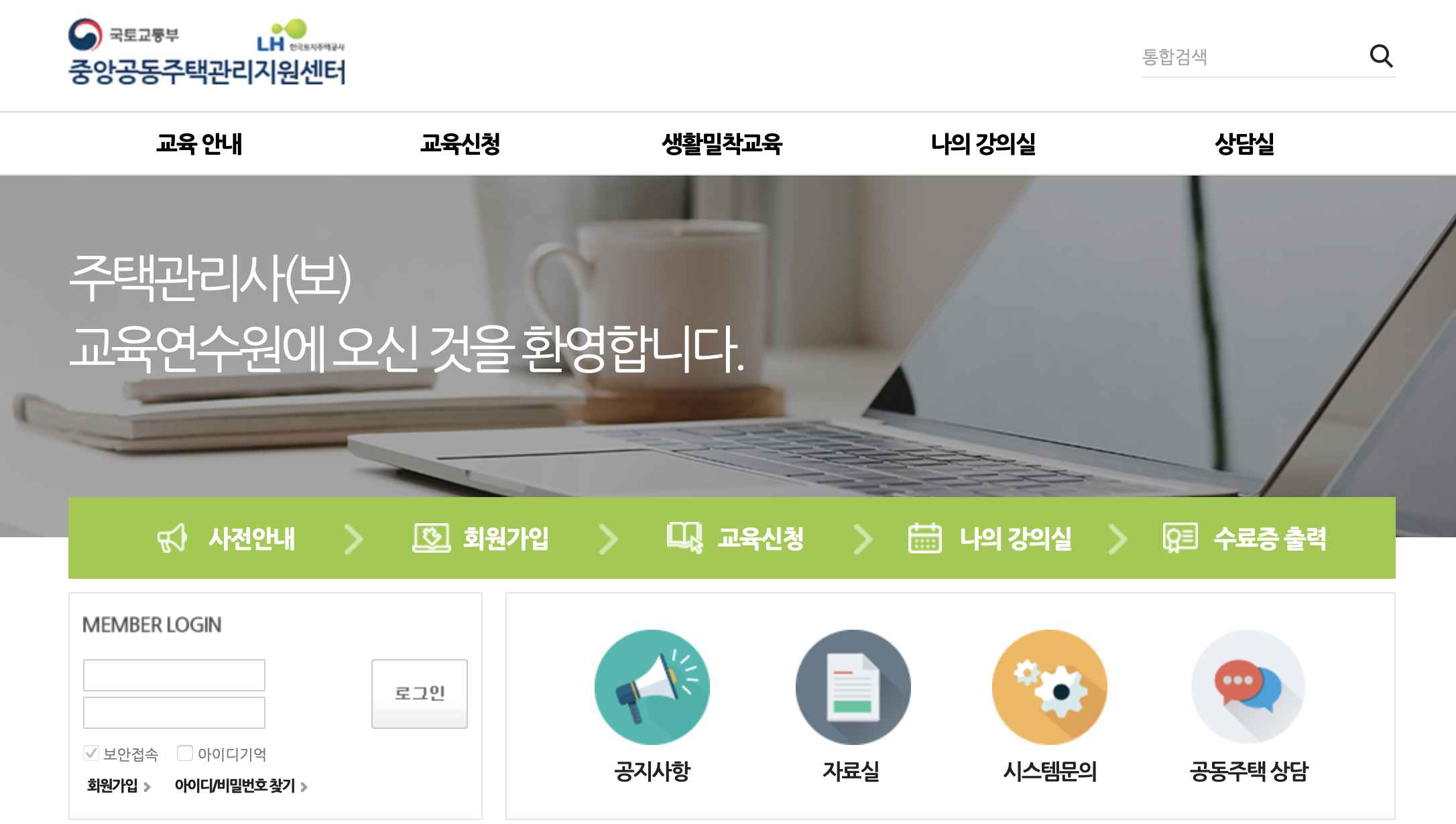 국토교통부 LH 중앙공동주택관리지원센터에서 운영하는 주택관리사 (보) 사이버 교육연수원 입니다. 배치교육 및 보수교육 수강일정과 수강기간에 맞게 잘 확인하시기 바랍니다.