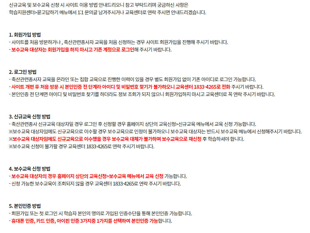 - 축산업 허가를 받으려는 자, 가축사육업의 등록을 하려는 자, 가축거래상인으로 등록하려는 자, 축산관계시설 출입차량 소유자 및 운전자는 지정된 교육기관에서 일정 교육과정을 이수하도록 의무화 함