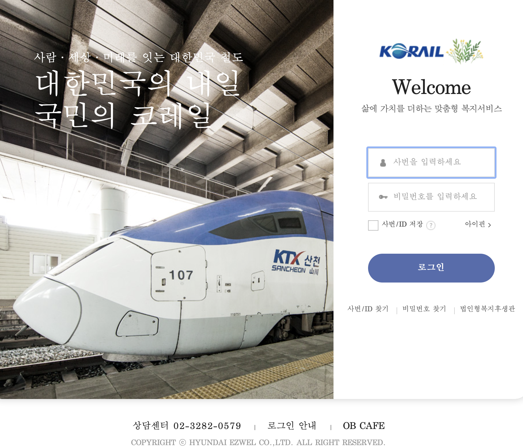 한국철도공사 사람 세상 미래를 잇는 대한민국 철도 대한민국의 내일 국민의 코레일. 삶에 가치를 더하는 맞춤형 복지서비스는 이지웰에서 운영되고 있습니다. 관련 문의가 있는 분들은 02 - 3282 - 0579 로 전화하시면 됩니다.