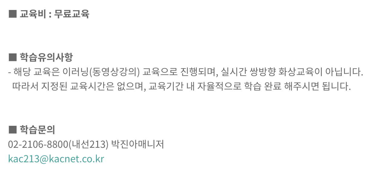 해당교육은 이러닝 (동영상강의) 교육으로 진행됩니다. 실시간 쌍방향 화상교육 아닙니다.